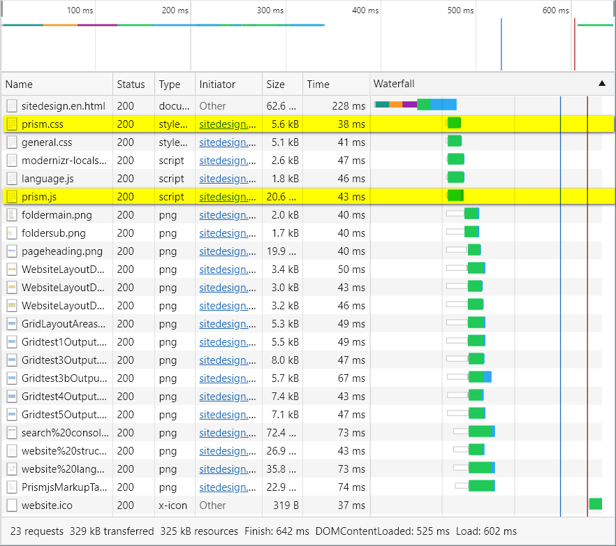 Note that I still include the prism.css file. Otherwise the code snippets would no longer be visible at all. The load time for the page is about 300mSec. This is the load time from the website to your browser and includes any processing on the client side. This will depend on your location and internet connection speed.